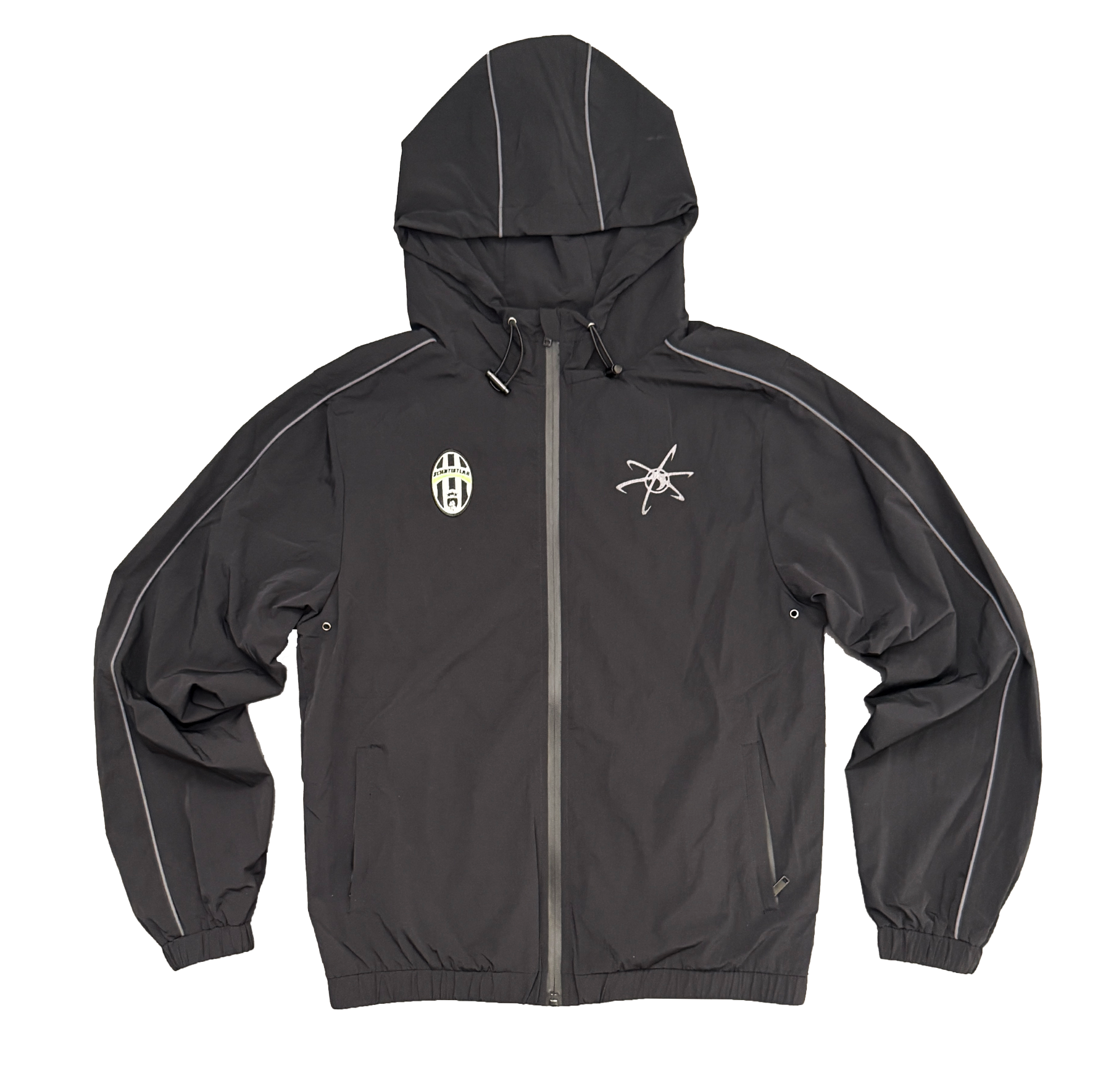 High quality waterproof jacket with mesh inside lining, front and back logos and reflective band on the sides and back.